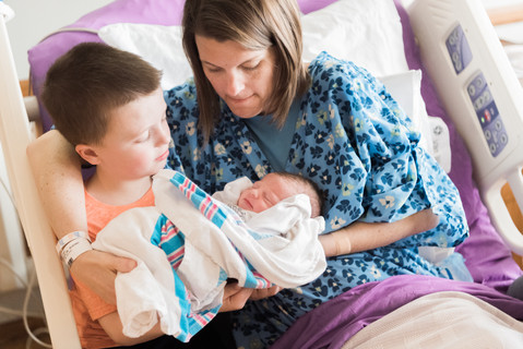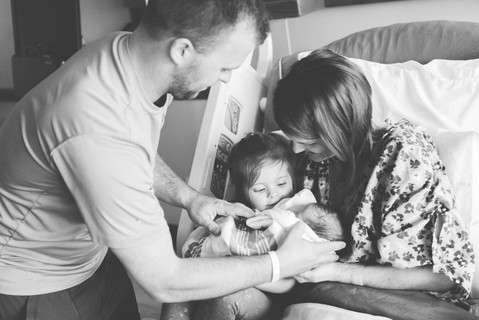 I took some photos that morning, then I went home and came back to the hospital later in the afternoon to photograph big brother & big sister meeting Amelia for the first time. I photographed each of their births years ago, so this was something I was very much looking forward to. Big brother Avery (6), being chatty & inquisitive, looked more grown up than ever. He kept his distance, but eventually warmed up and even gave baby Amelia a kiss. Big sister Adelynn (3), was giddy, full of smiles, and wanted to hold and kiss that baby over and over again. Watching Adelynn's genuine excitement over her new little sister, and watching the new family of 5 cuddle up together, was one of the sweetest moments I've ever witnessed. I am so happy for my friends and their newest little addition.